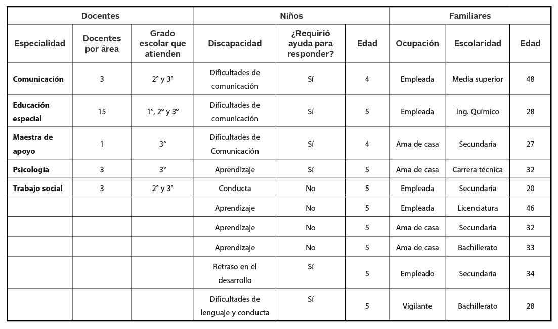En la fase preliminar de este estudio participaron diez niños con discapacidades y sus respectivas madres, así como 25 especialistas (todas eran mujeres) de educación especial del sector público del estado de Tlaxcala (México). Todas las familias pertenecen a un medio socioeconómico medio bajo o bajo. La edad de los padres de los alumnos fue de entre 27 y 48 años, con nivel educativo entre secundaria y superior. Los niños eran alumnos del nivel preescolar público de entre 5 y 6 años que presentaban dificultades de conducta, aprendizaje, lenguaje y retraso en el desarrollo. Para los fines de nuestro estudio no se han tomado en cuenta las diferencias o similitudes clínicas particulares de los niños que participaron en el mismo. Todos los participantes estuvieron de acuerdo en responder a las preguntas de las entrevistas y se mostraron interesados y colaborativos, incluyendo a los niños en edad preescolar.