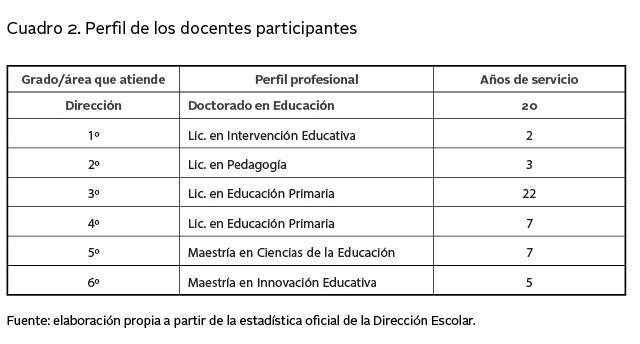 En la intervención participaron seis docentes y un directivo de una escuela primaria de la ciudad de Toluca, México, con jornada de tiempo completo. En el cuadro 2 de muestra el perfil profesional y laboral.