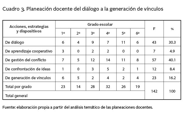También en las planeaciones docentes se reflejó, dado que 40.14% de las actividades planeadas atendían este rubro, con transformaciones evidentes, pues se pasó de la atención del conflicto de manera aislada, a la formación del sujeto para su gestión y resolución equilibrada. Esto permitió romper con la visión de una convivencia escolar estática y determinada, para comprenderla como un proceso de construcción continua, el cual debe ser direccionado desde la planeación misma.