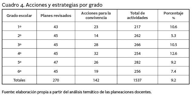 La incidencia de acciones y estrategias por grado, en promedio, para la construcción de la convivencia es de 9.2%, siendo la docente de 4º grado la que más utiliza este tipo de acciones con 12.6%, seguida de la profesora de 1º, con 10.6% y la de 3º, con 10.5%. No obstante que la docente de 1° resultó con la menor cantidad de actividades registradas (217) en 43 planes, aun así alcanza (10.6%) a estar por arriba del promedio general (9.2%). La docente de 5º se mantiene dentro del promedio de acciones, aun cuando fue quien más actividades contempló (282) en 47 planes. Los grados con más baja incidencia fueron 2º, con sólo 5.3% de acciones para la convivencia y 6º con 7.4%. Es importante resaltar el caso de la docente de segundo grado, quien planeó 262 actividades en 45 planes, siendo mínimas las acciones destinadas a fomentar la convivencia; no obstante, la observación no participante y las entrevistas permitieron apreciar que su actitud y hacer son propicias para la construcción de vínculos tanto con los alumnos, como con el resto de docentes. En sus propias palabras reconoce que