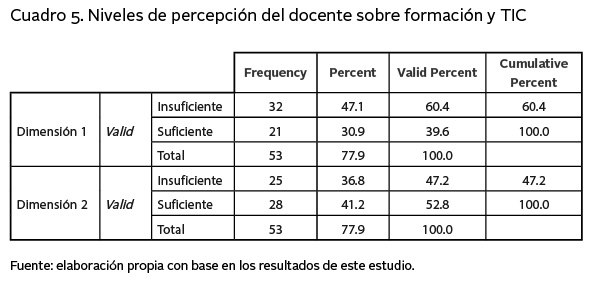 Al analizar lo arrojado por el test en cuanto al nivel de percepción de los docentes sobre la formación y TIC, se obtienen como resultado los descritos en el cuadro 5 que muestra los valores por criterios como insuficiente, suficiente y en capacidades para innovar.
