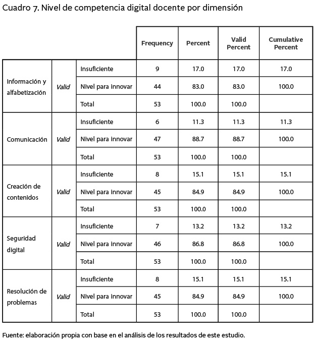 De acuerdo con lo descrito en el cuadro 7, en los cinco ámbitos de CDD, los participantes objeto del estudio mejoraron sus destrezas en cada uno de ellos, resaltando que 88.70% está en capacidades para innovar en el ámbito de la comunicación, siendo éste el de mayor puntaje entre aquellos evaluados; también en cuanto a la creación de contenidos y alfabetización digital los docentes obtuvieron 84.9% y 83.00%, respectivamente, demostrando así que estas áreas de CDD se deben trabajar más en su desarrollo, sin desmerecer que el promedio general es superior a suficiente como escala de interpretación planteada.