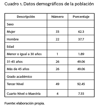 Los datos demográficos que fueron recogidos en los cuestionarios son: sexo (masculino, femenino), rango de edad del encuestado (menos de 25, 26 a 30 años, más de 30 años), nivel de formación académica (tercer nivel, maestría, doctorado), área de conocimiento (ciencias naturales o sociales, lengua y literatura, inglés, matemáticas, educación artística, bachillerato técnico), con un total de cinco ítems.
