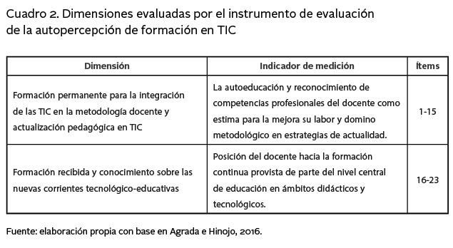 El instrumento de medición de autopercepción de formación en TIC en docentes o pre-test estuvo conformado por 23 ítems que se distribuyeron en dos dimensiones o ámbitos (Agreda e Hinojo, 2016), que se describen en el cuadro 2.