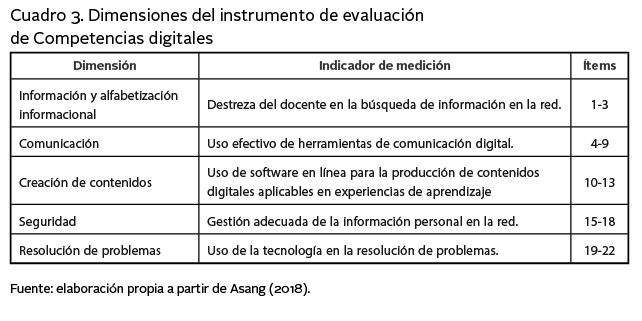 El post-test llamado Competencias digitales estuvo conformado por 21 Ítems y dividido por las siguientes dimensiones: Información y alfabetización informacional (3 ítems ), comunicación (6 ítems), creación de contenidos (4 ítems), seguridad (4 ítems), resolución de problemas (4 ítems) (cuadro 3). Éste tuvo un coeficiente Alfa de Cronbach de 0.97, lo que permitió determinar su fiabilidad (Asang, 2018).