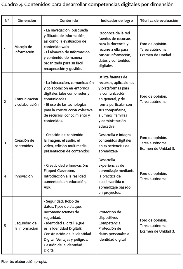 La intervención se basó en cinco bloques temáticos en relación con los ámbitos de las competencias digitales del marco común europeo, el cual describe las áreas Información y alfabetización informacional, Comunicación y colaboración, Creación de contenidos digitales, éstas son lineales o de aprendizajes concretos, tienen dominios que miden el uso de herramientas en acciones específicas, se desarrollan competencias a nivel de dominios instrumentales, que se refieren al uso diario de herramientas de búsqueda de información; buscadores, acceso a navegadores, elementos básicos para la búsqueda en Internet contextualizados de acuerdo con las necesidades docentes; por lo tanto, para determinar su dominio se debe tomar en cuenta el uso de recursos digitales en la práctica educativa que permitan al docente agregar actividades que estimulen el uso básico y técnico de herramientas digitales en el aprendizaje de sus estudiantes (Colás et al., 2019).