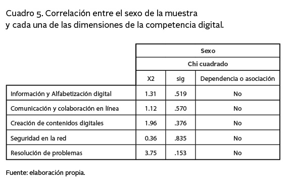 A partir de los resultados observados en los cuadros 4 y 5 se encontró que no existe relación entre las competencias digitales –así como cada una de sus dimensiones– y el sexo de los participantes; la prueba Chi cuadrado arrojó un valor sig. .0442, que es > 0.05, lo cual indica que ambas son independientes. Estos resultados muestran que el sexo no es determinante para la adquisición de las competencias digitales (Pozuelo, 2014).