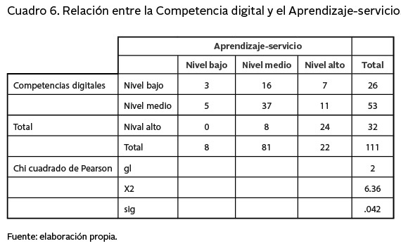 En el cuadro 6 se observa que la prueba Chi cuadrado alcanzó en valor sig. .042, lo que indica que existe relación entre las variables competencia digital y aprendizaje-servicio (ApS).