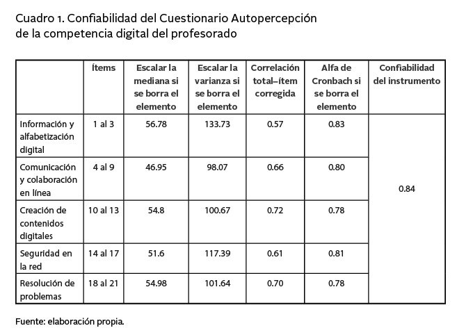 La investigación empleó dos instrumentos estandarizados: el primero fue el Cuestionario autopercepción de la competencia digital del profesorado de Pérez y Rodríguez (2016), que consta de 21 ítems agrupados en cinco dimensiones, en una escala de Lickert con valores del 0 al 4, donde el valor 0 indica que no se puede realizar lo que se exige, mientras el valor 4 indica el dominio completo de lo exigido. El baremo del instrumento se dividió en niveles bajo, medio y alto; el nivel bajo entre 21 a 49 puntos, el medio entre 50 a 77 y el alto entre 78 a 105. El segundo instrumento fue Cuestionario para la valoración de proyectos de aprendizaje–servicio de Escofet et al. (2016), conformado por 16 ítems agrupados en 5 dimensiones. La confiabilidad del primer instrumento se detalla en el cuadro 1, la cual alcanzó un valor de 0.84. La validación de los instrumentos se hizo a través de la validez de Aiken, se consultó a 11 expertos, ambos obtuvieron un valor de 0.95 lo que señala a los cuestionarios como confiables y válidos.