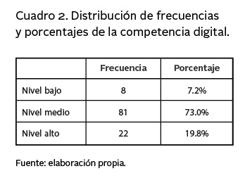 Respecto a los niveles de la Competencia digital, en el cuadro 2 se puede observar que el nivel medio alcanza el 73.0%, mientras el nivel alto obtiene un 19.8%.