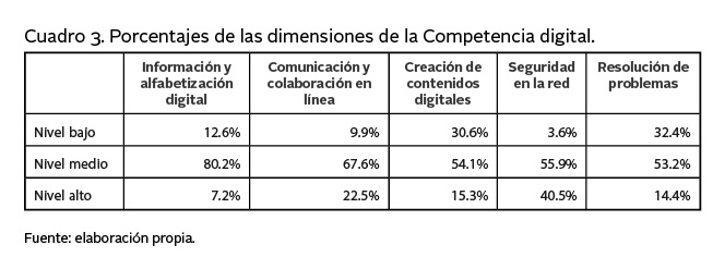 Los porcentajes que alcanzaron los docentes en cada una de las dimensiones de la Competencia digital se detallan en el cuadro 3.