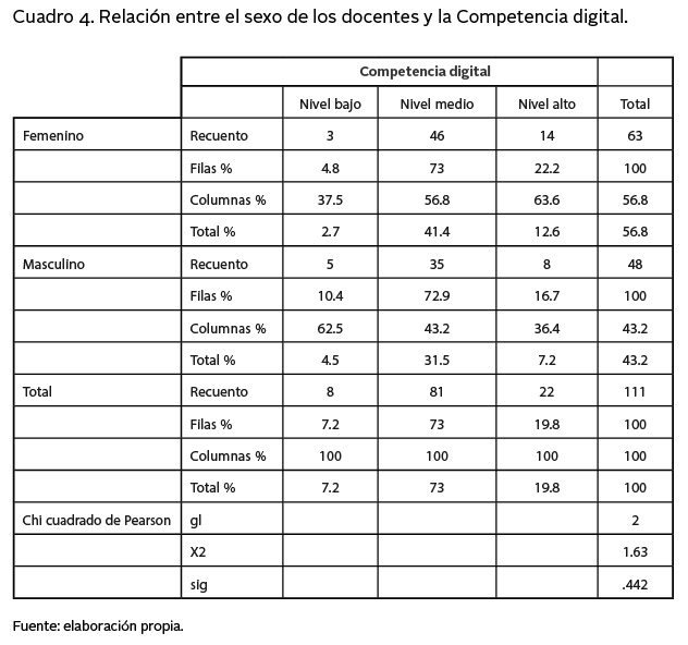 En el cuadro 4, se observa que el valor sig .442 de la prueba Chi cuadrado indica que no existe relación entre el sexo de los docentes y la competencia digital, lo que indica que el sexo no se asocia o es determinante con la adquisición de esta competencia.