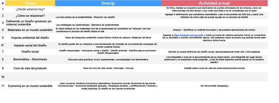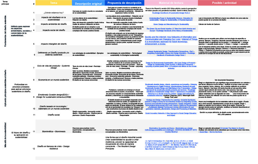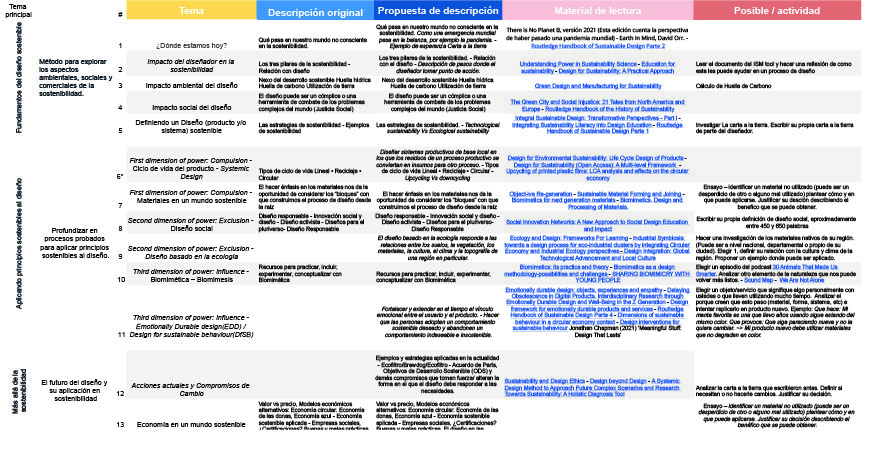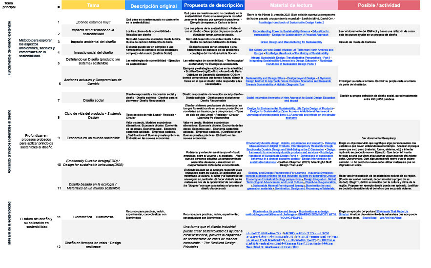 As a result, the program of a consistent yet dense and diverse course emerged, which is considered the latest development in design academia. Additionally, the greater sense of the course was complemented by self-directed research, which helped visualize different matters which will become relevant to the role of teaching design in the Guatemalan context. As a result, the original Design and Sustainability course covered ten main areas considered relevant to the practice of design (image 2).