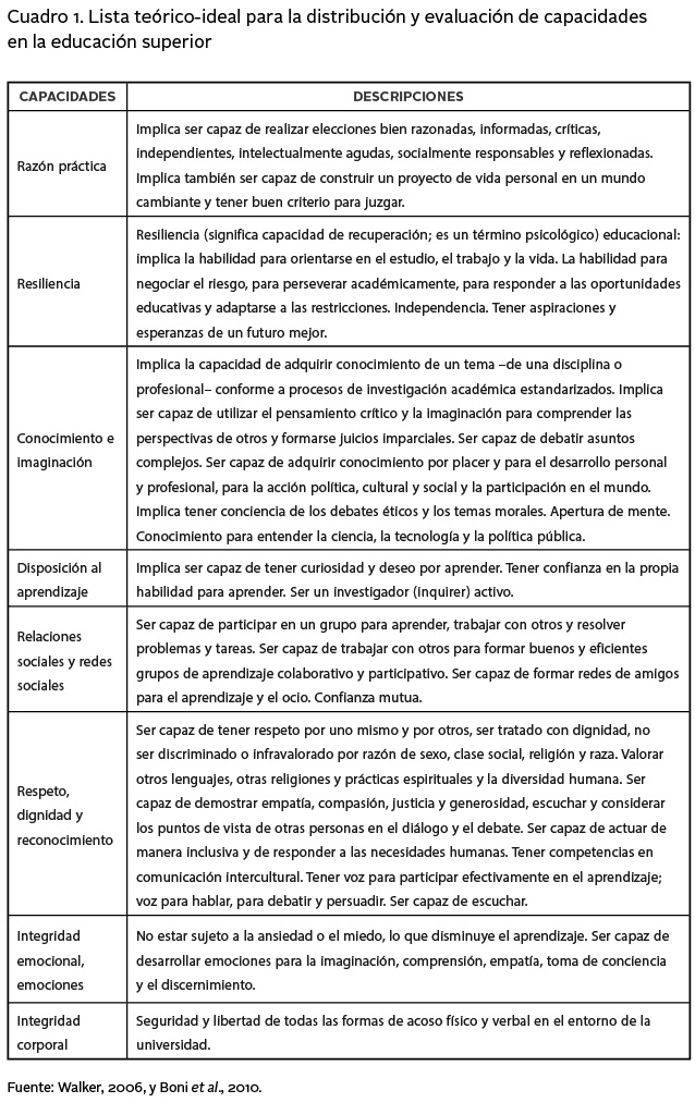 Después, y en la misma dirección, Walker (2006) lanzó una propuesta en forma de lista en la que, a partir de los principios presentados por Nussbaum, identifica ocho capacidades esenciales en la enseñanza universitaria; las cuales son entendidas como oportunidades que necesitan ser fomentadas en el alumnado y que consiguen asentar la teoría en la práctica (Boni et al., 2010) (véase cuadro 1).