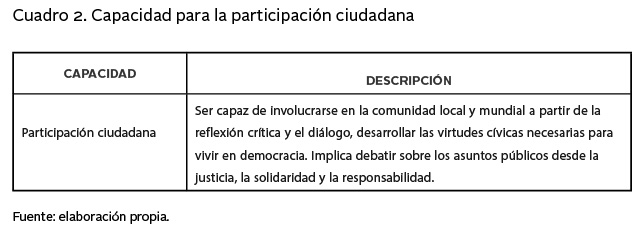 Educar con responsabilidad al alumnado para la formación de una ciudadanía cosmopolita también conforma otro de los desafíos educativos más recientes y complicados de lograr. Ser conscientes a nivel global de los problemas mundiales que suceden y participar en sus soluciones debe formar parte de nuestra agenda. No obstante, para conseguir cambiar esta mirada social, que solo presta atención a lo que ocurre en nuestro entorno más próximo, se requiere, por un lado, educar a las nuevas generaciones en la formación de virtudes cívicas para la participación y, por otro lado, fomentar en ellos el deseo de ponerlas en práctica. Será así como los más jóvenes asuman esta nueva forma de ser y estar en el mundo. Por todos estos motivos, se considera oportuno añadir esta capacidad para la participación ciudadana en asuntos tanto locales como mundiales, como lo refleja el cuadro 2.