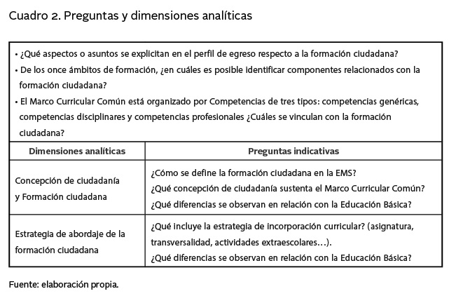 En una siguiente sección se presenta el análisis del Marco Curricular Común realizado con base en una matriz de indicadores que incluye componentes como: características y propósitos del modelo educativo, perfil de ingreso y de egreso, así como su organización curricular. Todo esto con el propósito de mostrar la incorporación de contenidos de la formación ciudadana en el currículo formal, mediante estrategias diferenciadas, a 23 años del giro discursivo realizado en el marco del surgimiento de la asignatura formación cívica y ética (SEP, 1999); de ésta se recupera tanto su enfoque pedagógico como algunos organizadores curriculares (perfil de egreso, ámbitos de formación, competencias), porque se le reconoce su potencialidad como referente clave para analizar el marco curricular de la educación media superior; lo anterior, bajo la premisa central de que la formación para la vida democrática en este tipo educativo tendría que retomar los aprendizajes cívicos y éticos impulsados durante la educación secundaria. Este planteamiento lo sugiere el mismo documento emitido por la Secretaría de Educación Pública en 2017, al proponer un perfil de egreso que abarca desde preescolar hasta bachillerato a fin de vincular todo el trayecto formativo de la educación obligatoria. Asimismo, en el documento se coloca a la “formación de una ciudadanía competente” como una de las cuatro funciones concretas. El orden de presentación es como sigue: “la culminación del ciclo de educación obligatoria, la formación de una ciudadanía competente, la formación propedéutica para la educación superior y la preparación para ingresar al mundo del trabajo” (SEP, 2017, p. 12).