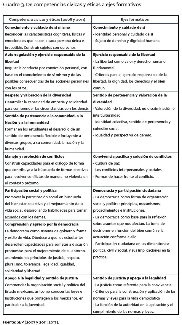 De acuerdo con los documentos publicados en el Diario Oficial de la Federación en 2022, es posible afirmar que el enfoque educativo basado en competencias tiende a desaparecer, al menos en el discurso. Sin embargo, tiene vigencia en los planes y programas de estudio de 2017. En esta reforma, las ocho competencias constituyeron seis ejes formativos, reorganizándose como se observa en el cuadro 3.
