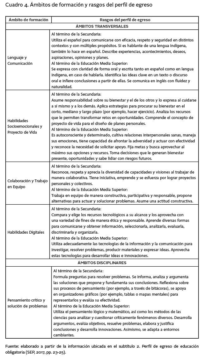 El perfil de egreso se define como “el conjunto de conocimientos, habilidades, y valores expresados en rasgos deseables para ser alcanzados por el estudiante al concluir la educación obligatoria” (SEP, 2017, p. 26). Además, es un elemento que orienta la estructuración de los planes y programas de estudio en todo el trayecto formativo de la educación obligatoria. Para los fines del análisis, sólo se recuperan los correspondientes a la educación secundaria y la educación media superior porque, siguiendo la argumentación de SEP (2017, p. 23), “los aprendizajes alcanzados en cada nivel educativo constituyen el fundamento de los aprendizajes del siguiente”. Sumado al perfil de egreso se encuentran los once ámbitos de formación que se mantienen hasta la educación media superior. Cuatro de ellos son ámbitos transversales: Lenguaje y comunicación; Colaboración y trabajo en equipo; Habilidades digitales, y Habilidades socioemocionales y proyecto de vida, los cuales deben “permear” las diversas experiencias y situaciones de aprendizaje y estar articulados en todas las asignaturas.