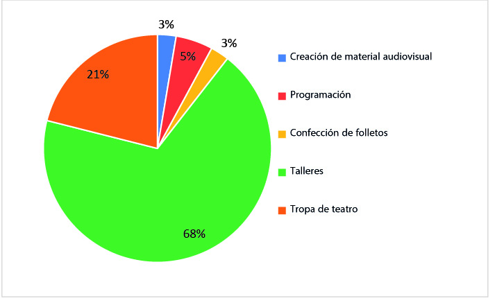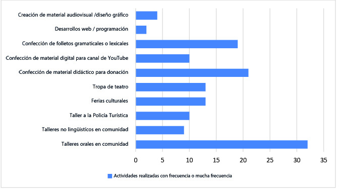 Como podemos observar en los cuadros 2, 3 y 4, hay una marcada superioridad en cantidad de mujeres respecto a otros géneros, lo cual se justifica en que la mayoría de personas estudiantes pertenecen a las carreras de Bachillerato en francés y en la Enseñanza del francés donde la mayoría de la población es femenina. Además, identificamos que la mayoría se encontraba entre su tercer y cuarto año de carrera al momento de realizar su TCU, lo que implica, para las carreras antes mencionadas, un nivel avanzado de lengua y una primera experiencia de práctica docente para las personas estudiantes de Enseñanza. Este nivel de formación les capacita para poder asumir las actividades que el proyecto propone, siendo la más frecuente los Talleres orales en comunidad como se observa en el gráfico 1, a continuación: