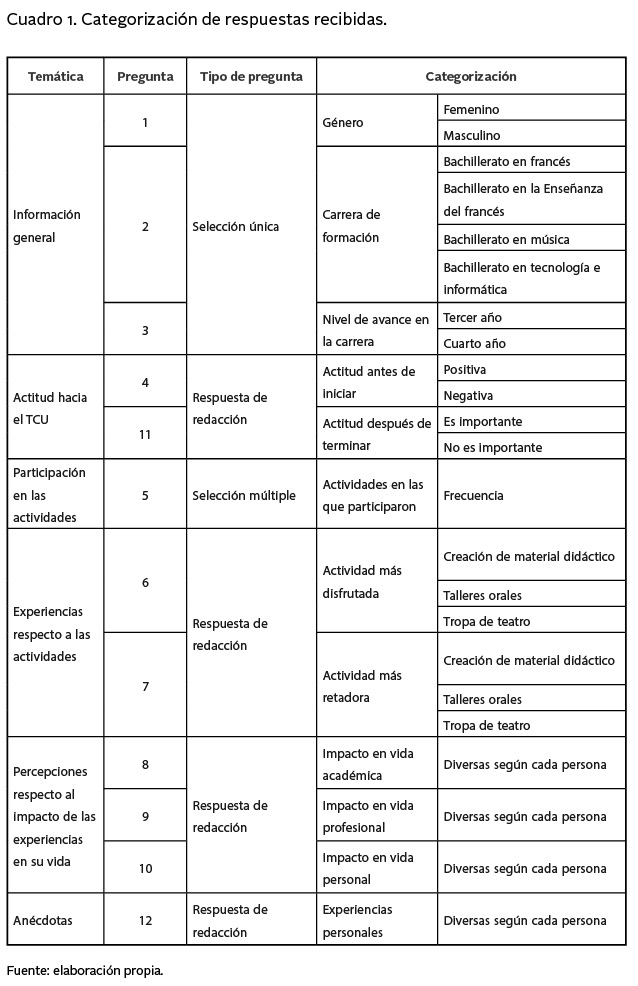 La otra técnica utilizada fue aplicar cuestionarios a un total de 42 personas participantes del proyecto de TCU-452 entre 2019 y 2022. La aplicación se extendió por tres días y cada persona requirió cerca de 15 minutos para completar el cuestionario. Según Villalobos (2019), esta técnica permite recolectar la información de las experiencias del estudiantado para proceder después a su análisis. Es importante identificar que, al momento de diseñar el cuestionario, se deben elaborar preguntas claras, comprensibles, que no incomoden, referentes a un solo tema y que no lleguen a inducir las respuestas (Hernández et al., 1998). Así las cosas, elaboramos un cuestionario que incluyó cuatro preguntas cerradas (de selección única) y ocho abiertas (la persona expresó su percepción en sus propias palabras) donde consultamos cuál era la actitud de la persona hacia tener que cumplir 300 horas de TCU como requisito para graduarse antes de empezar el proyecto, en cuáles actividades y con qué frecuencia participó en ellas, cuál actividad disfrutó más y cuál le representó un reto mayor, y si consideraba que todo estudiante debería vivir esa experiencia. Además, consultamos cuál es su percepción sobre el impacto que tuvo la práctica del TCU en su vida personal, académica y profesional.