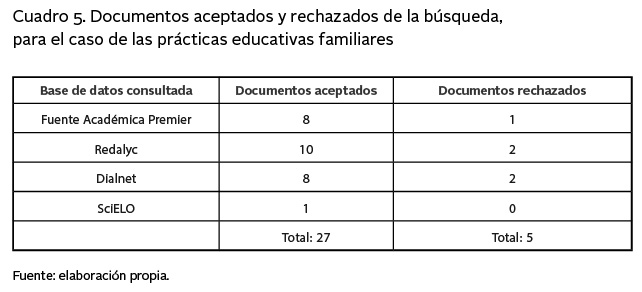 Para la fase de elegibilidad se aplicaron los siguientes criterios sobre el resumen de cada artículo: que se enfocara a los países de América Latina en los procesos de inclusión-exclusión/autoexclusión de la diversidad de familias dentro de los espacios educativos y en sus interacciones, así como en las prácticas pedagógicas, su aplicación y capacitación. El resultado de este proceso de selección, contando los repetidos (hubo ocho elementos repetidos; seis para el caso de prácticas educativas familiares y dos para el caso de la interacción familia-escuela), arrojó documentos que cumplían con alguno o todos los criterios mencionados. El cuadro 5 presenta los resultados para cada base de datos consultada, para el caso de las prácticas educativas familiares.