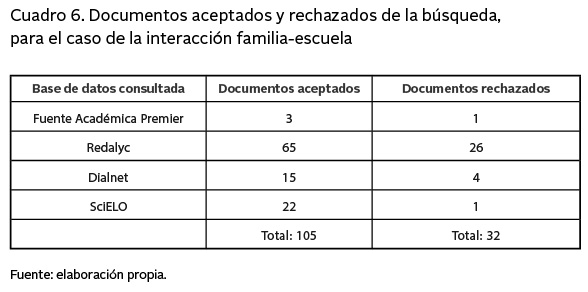 El cuadro 6 presenta los resultados para cada base de datos consultada, para el caso de interacción familia-escuela.