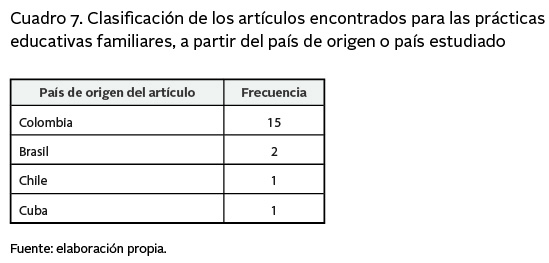 El siguiente paso fue la revisión de los resúmenes de cada artículo, así como la revisión de fragmentos específicos dentro del texto, donde aparecieran las palabras clave para determinar el contexto en el que son utilizadas. De esta manera, los documentos son clasificados a partir de su nacionalidad y frecuencia por país, así como por la profundidad en que abordan los temas sobre los que gira este trabajo. El cuadro 7 presenta esta clasificación, a partir del país de origen o país latinoamericano estudiado, para el caso de las prácticas educativas familiares, descontando los elementos repetidos.