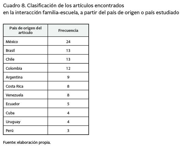 El cuadro 8 presenta esta clasificación, a partir del país de origen o país latinoamericano estudiado, para el caso de la interacción familia-escuela, descontando los elementos repetidos.