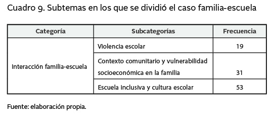 A partir de la revisión sistemática fue posible identificar un hallazgo que no se había planteado de inicio, el cual consiste en los temas que se abordan en la revisión sistemática, en particular aquéllos referentes a la interacción familia-escuela. En el cuadro 9 se muestran los subtemas que se identificaron en la interacción familia-escuela, además de tres dimensiones que se trabajan en conjunto.