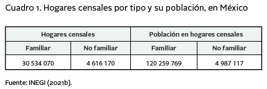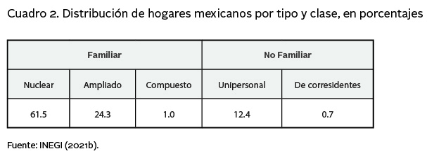 Países como México se caracterizan “por tener fundamentalmente familias de tipo nuclear” (INEGI, 2021a, p. 136); sin embargo, el Censo de Población y Vivienda más reciente realizado por el Instituto Nacional de Estadística y Geografía (INEGI) durante 2020, detectó una serie de factores que explican las modificaciones que ha sufrido este modelo de organización familiar; entre ellos destacan “los cambios demográficos y sociales de las últimas décadas” (INEGI, 2021b, p. 136), que se explican por “la caída de la fecundidad, la disminución de la mortalidad infantil, el incremento de la esperanza de vida, el envejecimiento de la población, la inserción de la mujer en el mercado laboral… y el aumento en el nivel de escolaridad”, entre otros (INEGI, 2021b, p. 136). De acuerdo con el INEGI (2021a), estos fenómenos poblacionales generan reconfiguraciones de la familia, de manera tal que podemos encontrar “hijos viviendo sólo con la madre o el padre, y población adulta mayor que vive sola o cambia su residencia con un familiar o viceversa”.