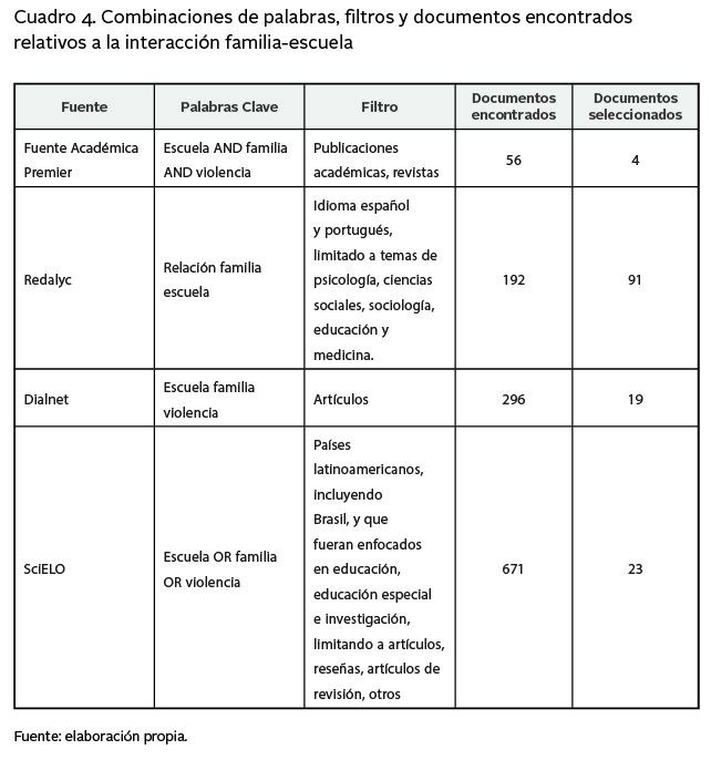 Para el caso de los trabajos que tratan de la interacción entre espacios educativos se siguió la misma metodología. Las palabras clave fueron: familia, escuela, violencia, y relación familia-escuela. En las bases de datos que ofrecían filtros para buscar, se incluyeron filtros para países latinoamericanos, para un tiempo de veinte años y para los temas de educación. De esta búsqueda se obtuvieron 137 documentos con el potencial de cumplir con las características requeridas de análisis. Para facilitar la gestión y revisión de estos documentos, se utilizó la aplicación de escritorio Mendeley. El cuadro 4 muestra todas las combinaciones de palabras usadas en cada base de datos, así como los filtros utilizados y los documentos encontrados en cada una.