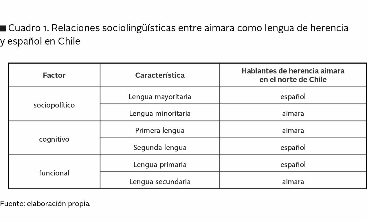 A pesar de que el español es la lengua dominante en todos los países de Sudamérica, el aimara es ampliamente hablado en Bolivia, en el sur del Perú y en el norte de Chile (Adelaar, 2012). Por esta situación de lenguas en contacto, generada principalmente por familias aimaras translocalizadas por efectos de la migración constante de Bolivia hacia Chile (González Cortez, 2007), muchos aimaras en esta zona son bilingües tempranos, es decir, adquieren la lengua ancestral y el español en la temprana infancia. Sin embargo, el estatus sociopolítico del aimara en un país donde la lengua oficial es el castellano, influye en el proceso de adquisición de las lenguas, trae como resultado que los actuales miembros de las comunidades aimaras en la región posean el perfil de hablante de herencia (HH), es decir individuos que adquieren su lengua materna (o de herencia) en un país donde ésta es minoritaria, y adquieren la lengua oficial y dominante (en este caso el español) como segunda lengua.