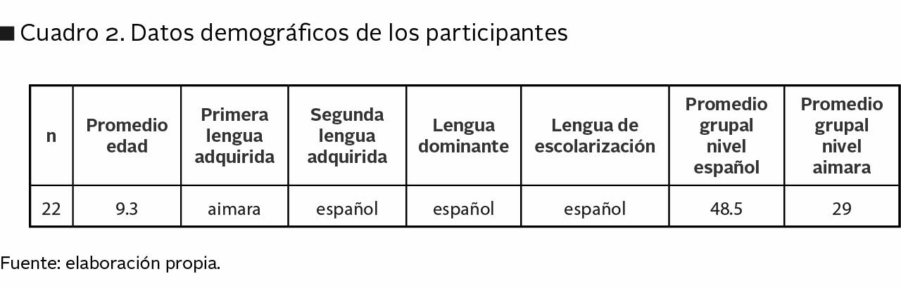 Los participantes se consideraban bilingües de herencia si primero habían aprendido aimara y luego español y si obtenían más de tres puntos en dos preguntas de escala Likert que examinaban la cantidad de exposición al aimara en el hogar desde el nacimiento hasta los dos años. En cuanto al nivel de las lenguas habladas, se aplicó una versión modificada del Test Multilingüe de nombramiento (Gollan et al., 2012) que tenía un puntaje total de 54 puntos para cada lengua y el corte mínimo para cada lengua era 27, equivalente a un nivel intermedio. En el cuadro 2 se resumen datos demográficos relevantes de los participantes para la presente investigación.