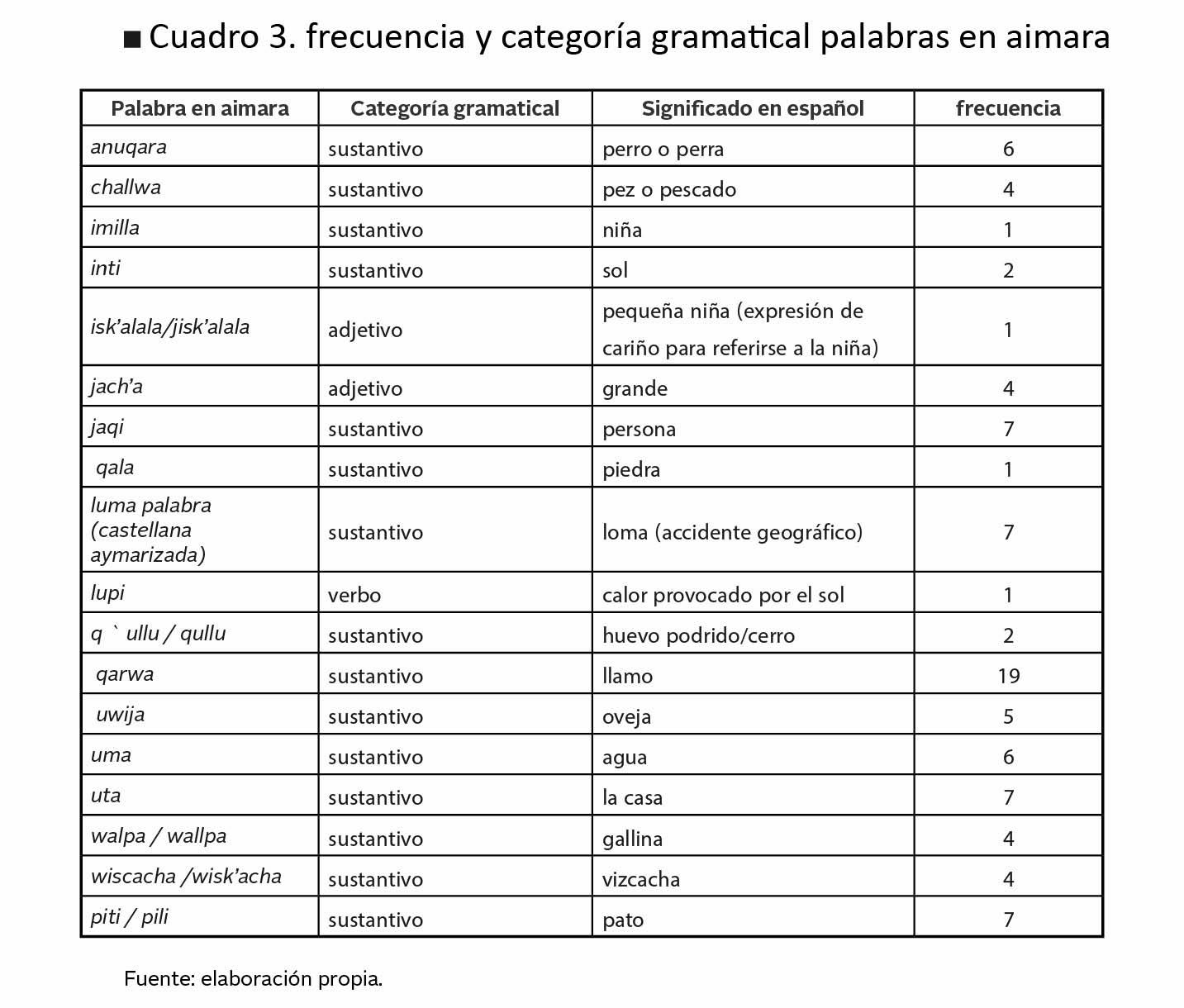 Este análisis presenta una descripción de la presencia de léxico aimara en el relato escrito en pasado de los 19 textos analizados. Con respecto al léxico aimara, se identificó un total de 88 palabras. El cuadro 3 presenta la frecuencia por palabra y la categoría gramatical.