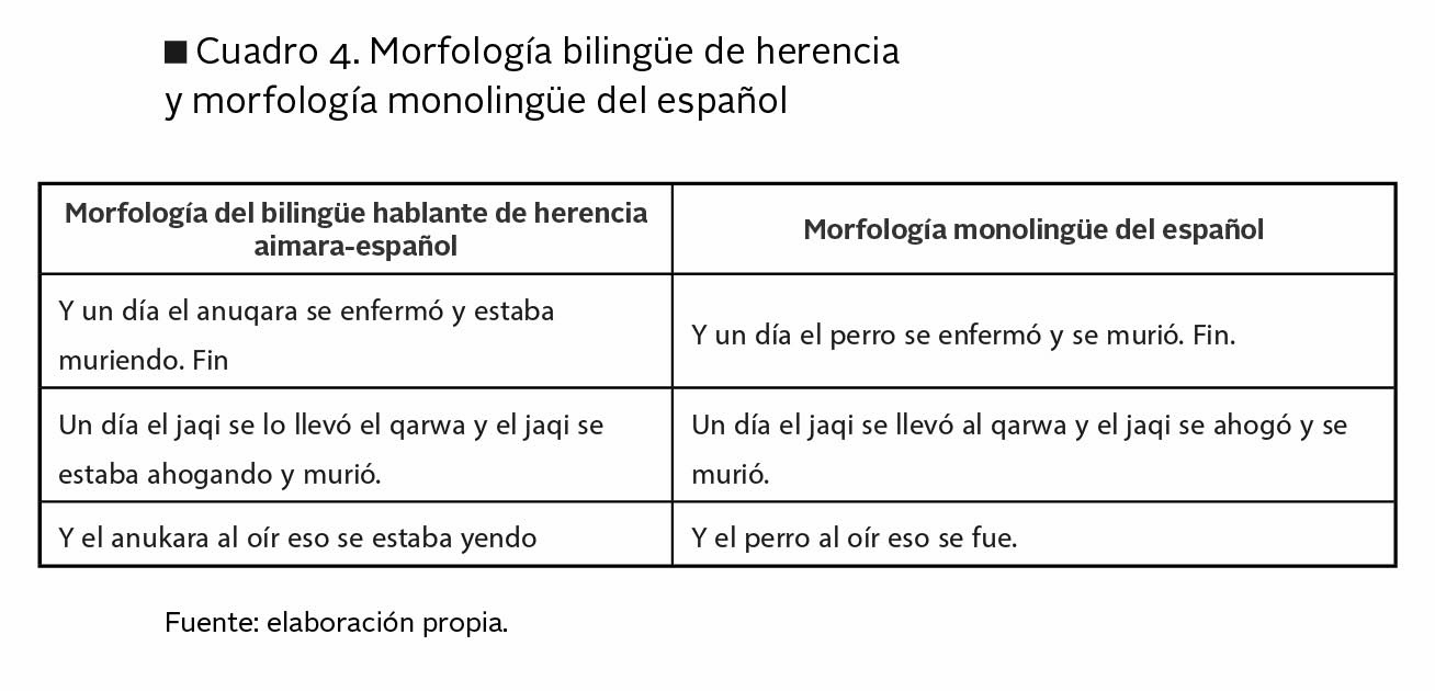 Cabe mencionar que, en el proceso de adquisición de lenguas, a partir de los 18-30 meses, se desarrolla en el infante la capacidad de generar oraciones, manteniendo la sintaxis propia de la lengua a la cual el niño se encuentra expuesto. Si se considera que nuestros participantes estuvieron expuestos a la lengua aimara de los 0 a los 36 meses en promedio, tenemos fundamentos cognitivos para afirmar que la sintaxis de la lengua de herencia está en constante interacción con la sintaxis del español, aunque el español sea la lengua dominante de los hablantes.