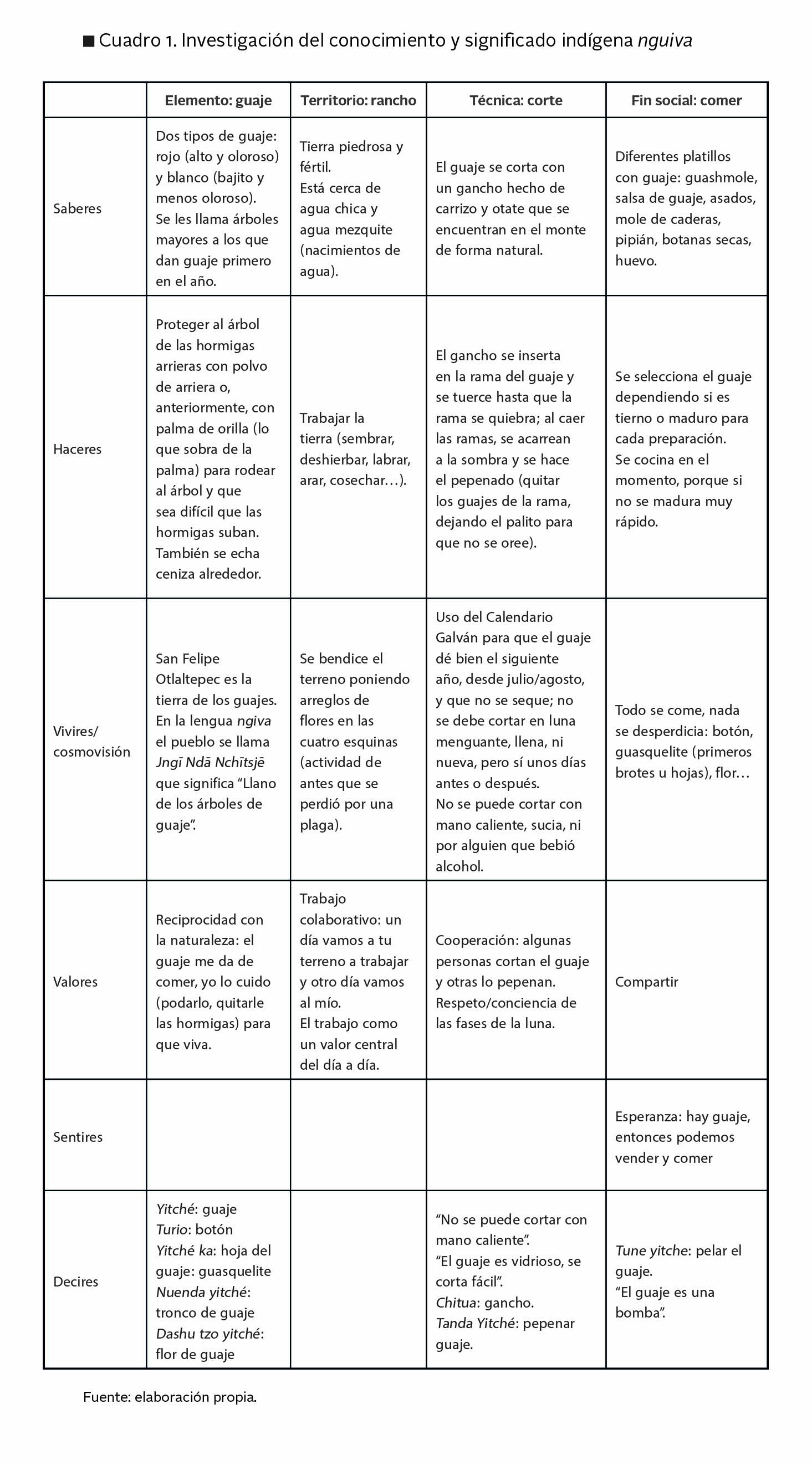 Después de identificar la frase prototípica, me enfoqué en la investigación a partir de la convivencia con las personas de la comunidad; sistematicé este conocimiento indígena en un cuadro. La convivencia/investigación sucedió durante toda mi estancia en la comunidad. Al estar sumergida en su realidad, en los momentos que menos lo esperaba me compartían sus conocimientos, lo que fue parte fundamental las relaciones de confianza con las y los sabios de la comunidad, además de tener la oportunidad de acceder a distintos espacios con diferentes actores que abrieron mi panorama y me compartieron su sabiduría. La investigación como un ir y venir, en la que nuevas preguntas siempre surgen.