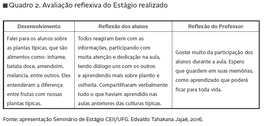 O estágio traz, como prática, o conhecimento pertinente e contextualizado à experiência do manejo de mundo como fundamental para a sobrevivência das crianças Javaé. Assim, como pode ser visto no quadro abaixo e nas figuras 3 e 4, o estudante trabalhou o tema do plantio da mandioca nas cinco aulas que ministrou com os alunos da escola Tainá. A quinta aula foi dedicada ao plantio da mandioca (como pode ser visto nas fotos mostradas adiante) e a reflexão sobre a importância do analisar desse saber e prática para os estudantes do povo Javaé (quadro 2).