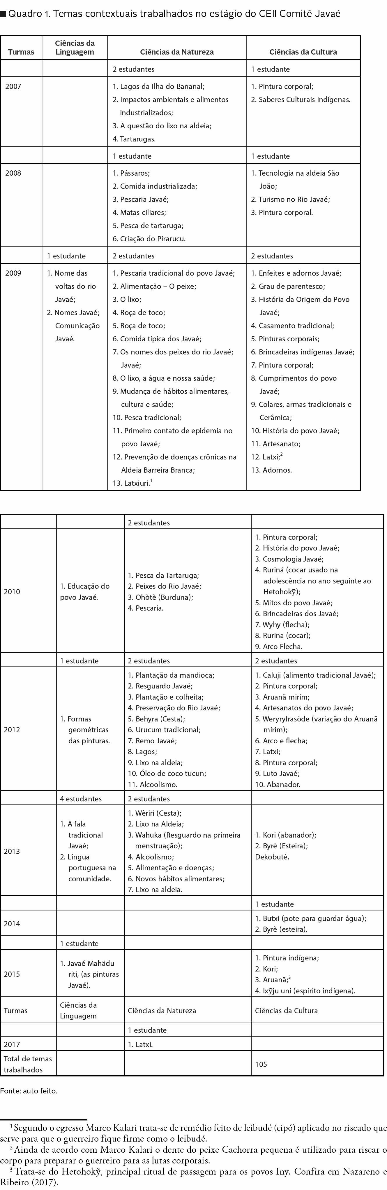Como será demonstrado a seguir, no quadro 1, a escolha dos temas contextuais ao longo dos últimos doze anos esteve em grande parte voltada para assuntos relacionados aos conhecimentos do povo Javaé, seus problemas cotidianos e a retomada de seu protagonismo como povo indígena.