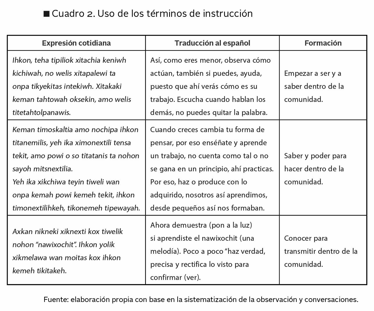 De acuerdo con la aportación anterior, la epistemología masewal-nahua requiere una sistematización y transducción espacio-tempo y lingüístico-cultural que permita su reflexión y aplicación. Bajo esta perspectiva, se observa que, para el empleo de los conceptos, se usa el prefijo imperativo /xi/ que aparece en contextos cotidianos para la instrucción-formación según se presenta en el cuadro 2.