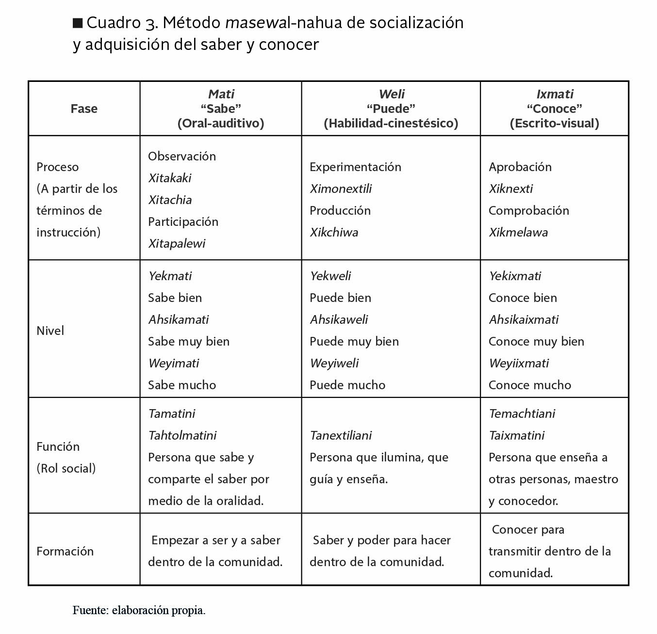 El saber y el conocer requieren habilidades para su formación. De esta manera, la fase weli juega un papel intermedio, y la cultura oral de la sociedad masewal favorece la transmisión de las producciones a otras generaciones. Asimismo, ambas construcciones poseen diferentes niveles demostrables por medio de la orientación de cada una. En el cuadro 3 se recapitula la sistematización y los términos profundizados.