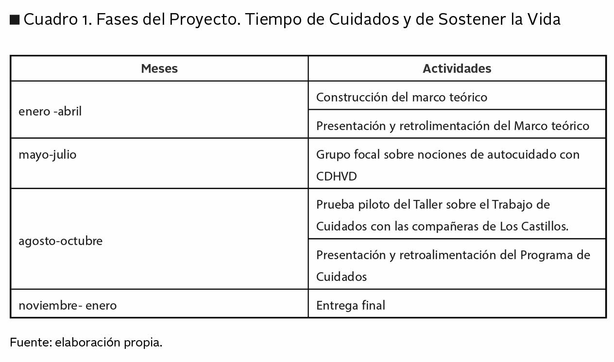 De este último se desprende la necesidad de realizar una serie de talleres sobre el reconocimiento del trabajo de cuidados y el autocuidado de las mujeres de Los Castillos, pues en estos años se han dado cuenta de que las mujeres realizan dobles, triples o cuádruples jornadas postergando su salud e integridad. Es por ello que el CDHVD propuso el proyecto “Tiempo de Cuidados y de Sostener la Vida”, financiado por Fondo Semillas para llevar a cabo la construcción de un marco teórico, un encuentro, una serie de seminarios con académicos, investigadores y sociedad civil especialistas en el trabajo de cuidados y el programa sobre cuidados con las mujeres de Los Castillos. Nosotras cooperamos en la construcción de dos insumos que forman parte de un documento, el marco teórico y el programa sobre cuidados. A continuación, se narra cómo se construyó (cuadro 1).