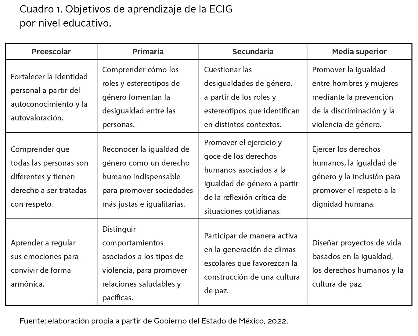 Como puede observarse en el cuadro 1, en la ECIG se plantea comenzar en preescolar con el fortalecimiento de la identidad de niñas y niños, el respeto a la diversidad de las personas y el mostrarles cómo regular sus emociones para convivir de forma armónica.