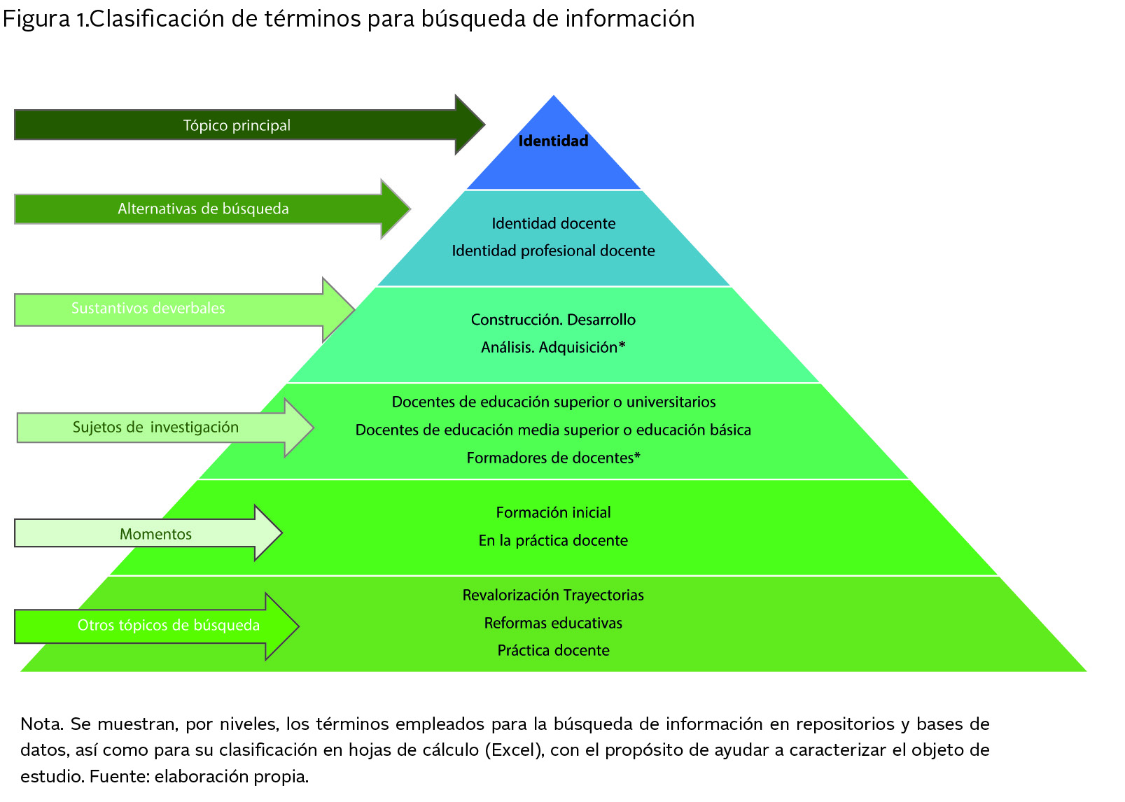 Se muestran, por niveles, los términos empleados para la búsqueda de información en repositorios y bases de datos, así como para su clasificación en hojas de cálculo (Excel), con el propósito de ayudar a caracterizar el objeto de estudio