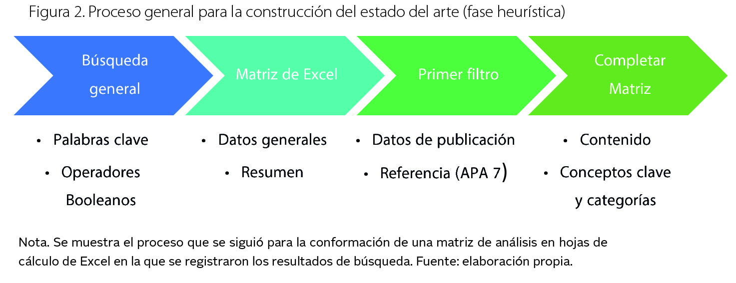 Fuente: elaboración propia.Una vez establecidos los términos de búsqueda, se recurrió a buscadores especializados y bases de datos y para la sistematización de la información; con ayuda de hojas de cálculo de Excel se comenzaron a registrar datos generales de los documentos encontrados, incluidos datos de publicación, palabras clave y resumen para, después, generar estadística y comenzar a realizar los análisis. A manera de resumen (figura 2): se realizó una búsqueda general, luego se hizo una discriminación de la información y se identificaron y registraron los datos de interés de las publicaciones seleccionadas, con lo que la hoja de cálculo de Excel se convirtió en una matriz de análisis.