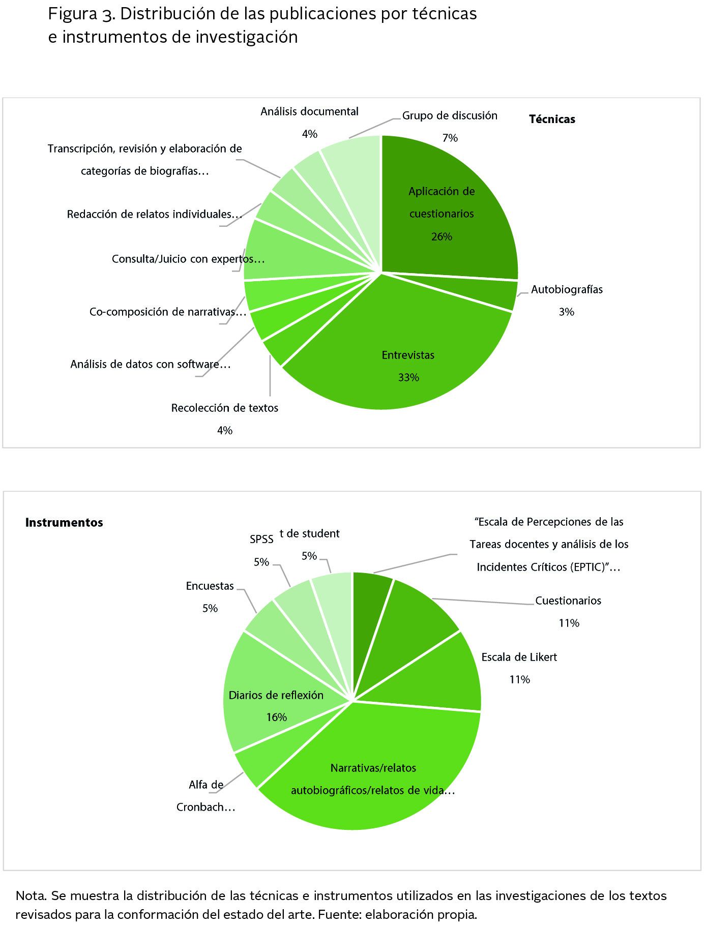 Se muestra la distribución de las técnicas e instrumentos utilizados en las investigaciones de los textos revisados para la conformación del estado del arte.