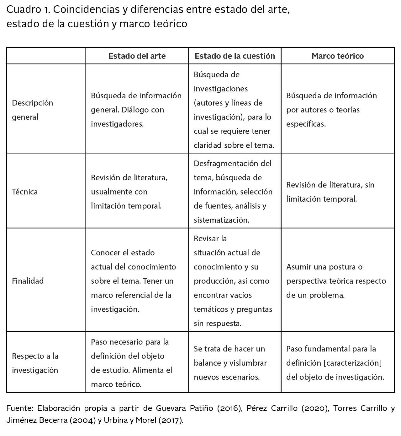 En el cuadro 1 se presenta una comparación de aspectos generales de acuerdo con lo cual se presume que, en cuanto a profundización epistemológica, el marco teórico prosigue al estado de la cuestión y éste al estado del arte; es decir, mientras que el estado del arte se trata de una aproximación para tener un marco referencial, en el estado de la cuestión el investigador habrá de identificar qué no se ha hecho sobre el tema y cómo puede contribuir a la generación del conocimiento, y en el marco teórico deberá adoptar una teoría desde la cual abordar su objeto de investigación.
