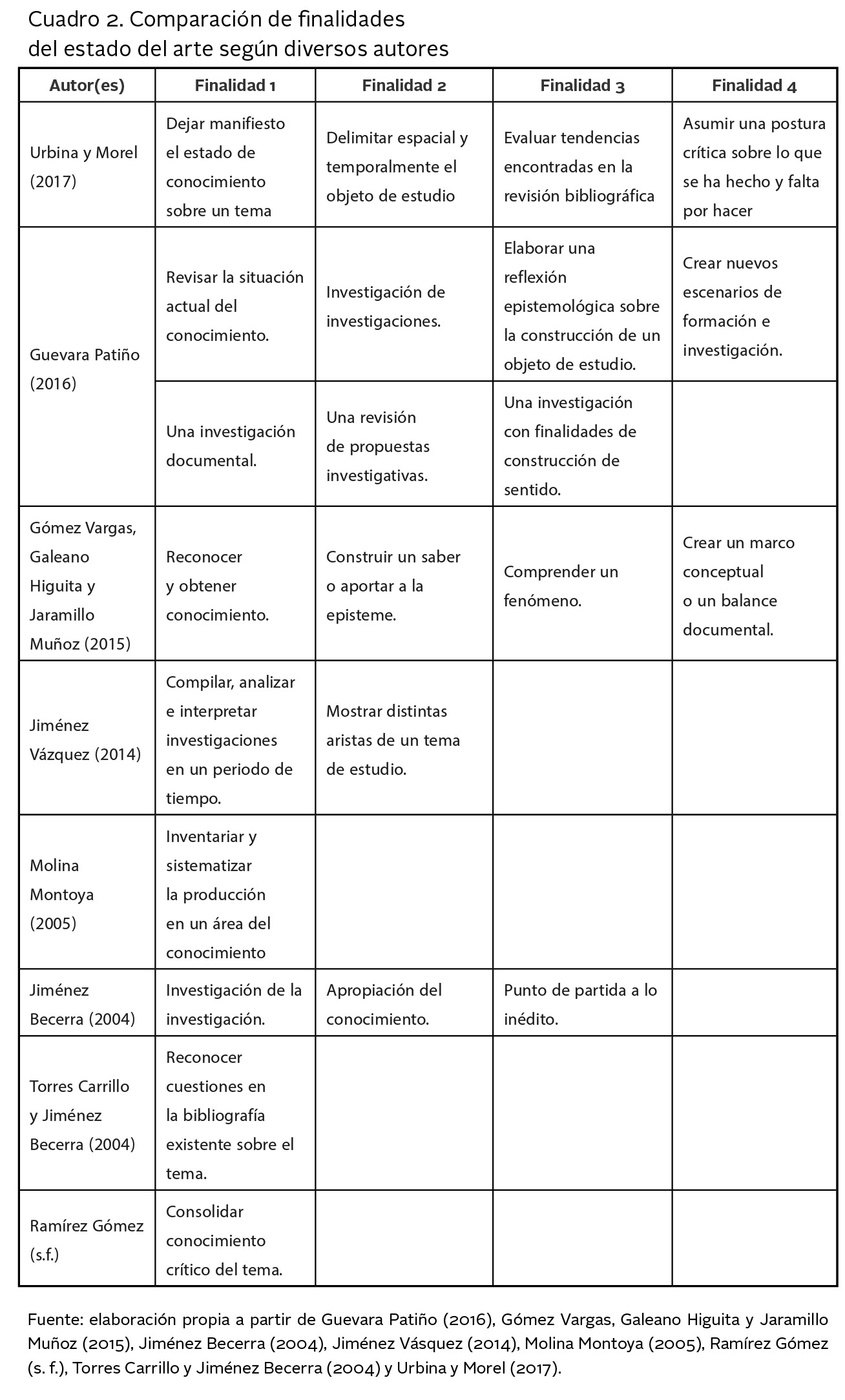 Como puede notarse en el cuadro 2, existen diversas finalidades que los autores atribuyen a la elaboración de un estado del arte, desde el reconocimiento de autores y planteamientos teóricos a la definición de una postura; en cualquier caso, se trata de una revisión de fuentes necesaria para todo proceso de investigación, sobre todo cuando hace falta claridad sobre el tema a investigar, de ahí que para el presente trabajo se haya optado por la realización de un estado del arte, puesto que se precisaba contar (en un inicio) con un panorama general de lo que se ha investigado recientemente sobre la identidad profesional docente.