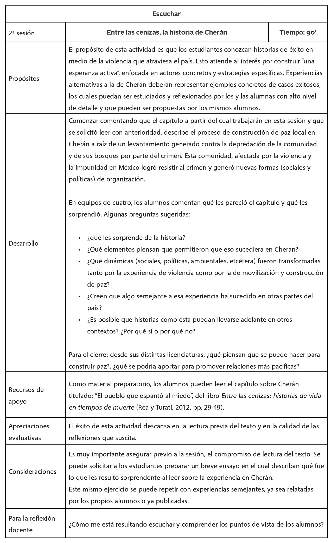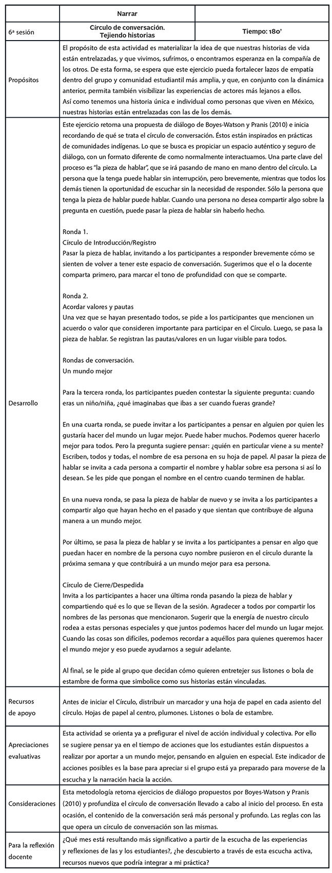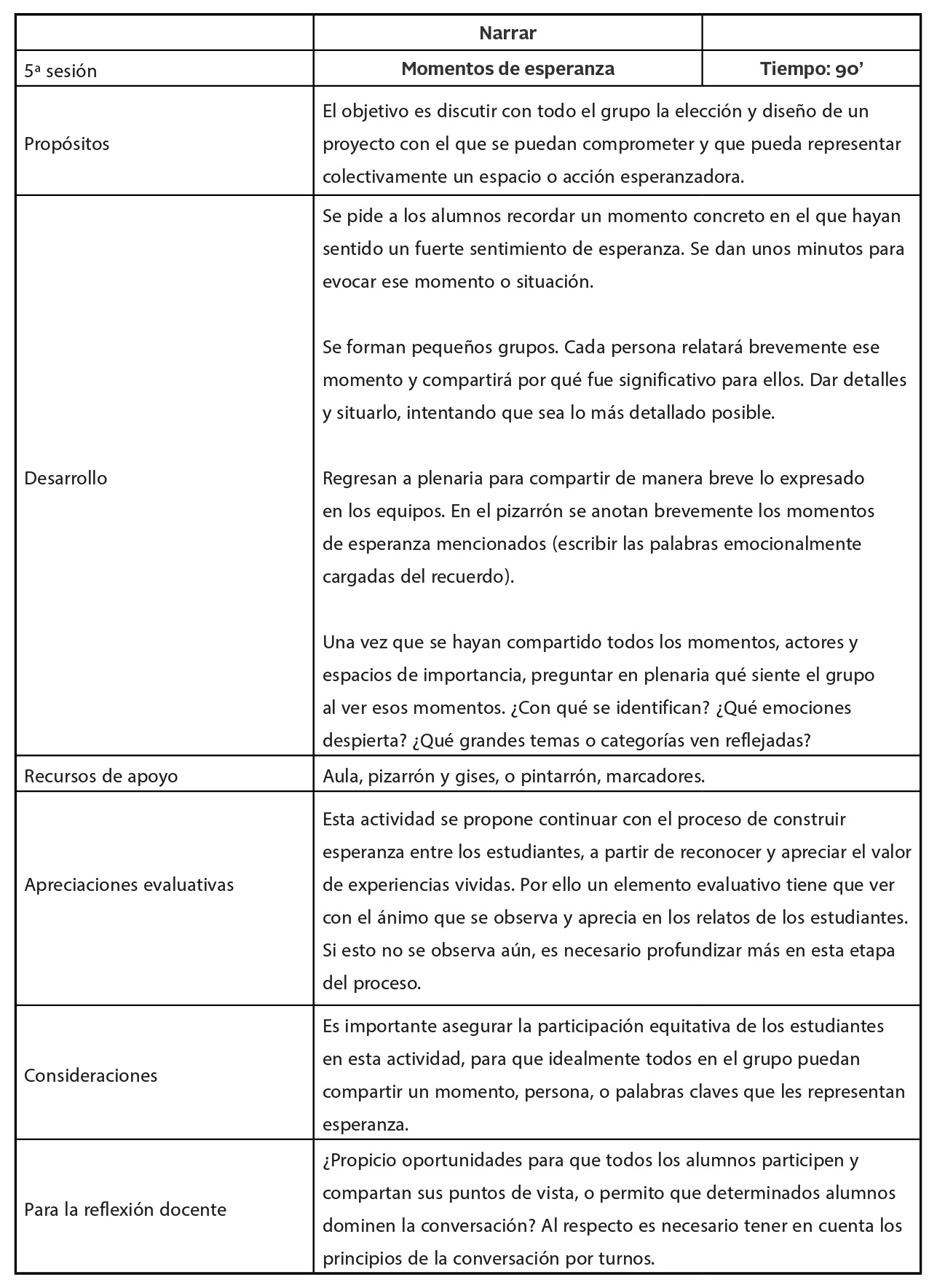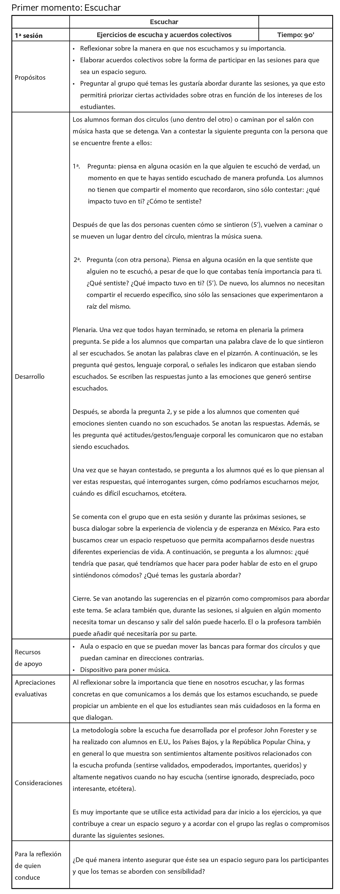 Como señalamos, esta propuesta surge del interés por explorar la pertinencia de crear espacios que, por un lado, permitan a las y los estudiantes, así como a sus docentes, reconocer el dolor asociado al deterioro de seguridad en México, a la vez que generar una apertura a la esperanza basada en la oportunidad de escuchar, narrar y actuar; es decir, de un movimiento orientado a fortalecer la agencia colectiva de los alumnos.