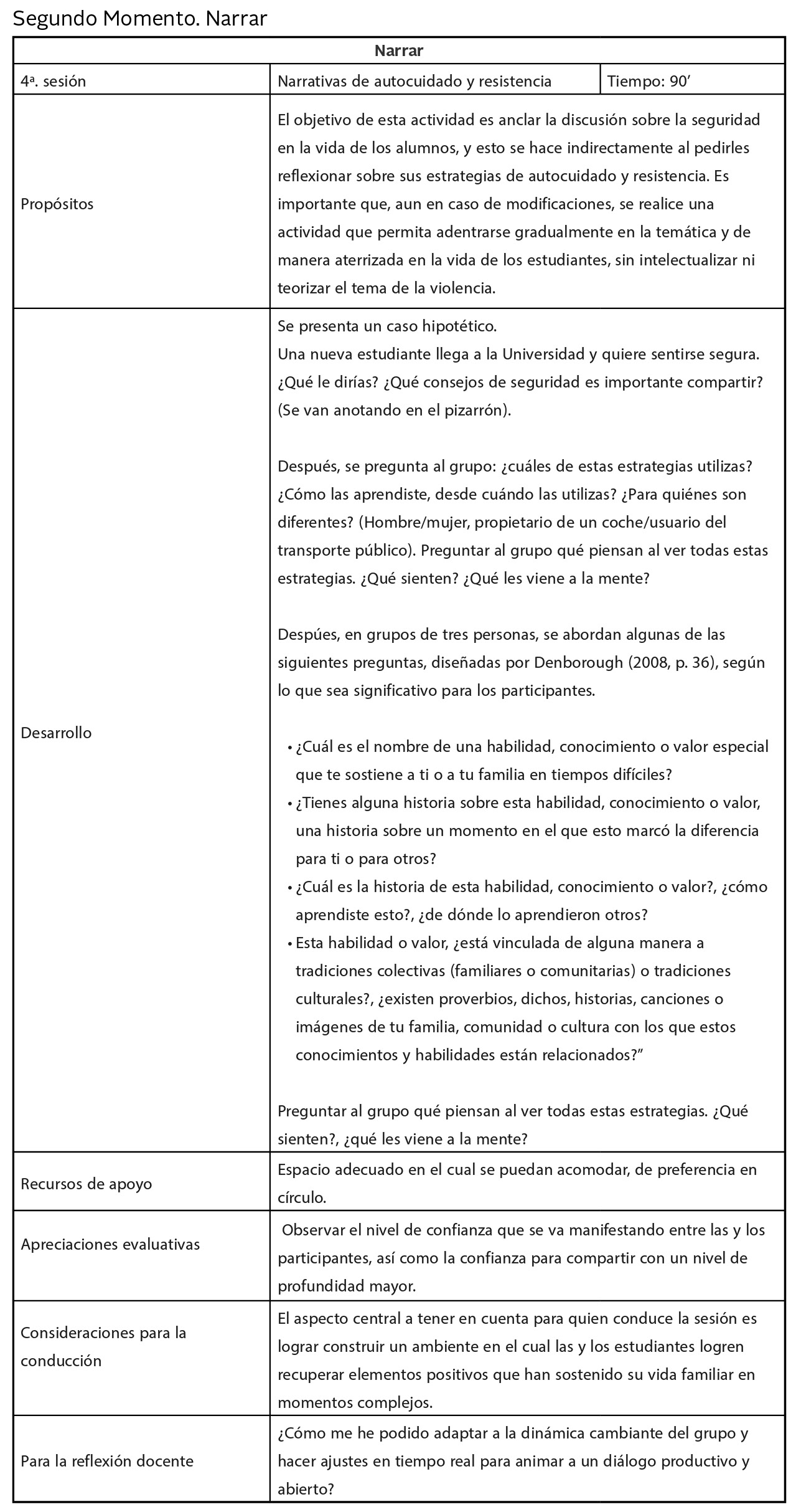 : Este trabajo busca contribuir al desarrollo de estrategias pedagógicas para el diálogo con estudiantes universitarios, en un contexto nacional marcado por crecientes niveles de violencia social derivados de la "guerra contra el narcotráfico" en México. Al retomar conceptos como trauma psicosocial y educación en contextos de emergencia, destaca la necesidad de abrir espacios curriculares para reflexionar sobre el impacto personal y colectivo de la violencia. La propuesta se inscribe en la pedagogía crítica para la paz e integra prácticas narrativas, círculos restaurativos y mediación. Herramientas pedagógicas permiten al profesorado conducir sesiones de diálogo en un entorno seguro, orientadas a fortalecer vínculos sociales y explorar recursos para la acción individual y colectiva. Escuchar, narrar y actuar son las fases de esta aproximación, que representa un esfuerzo desde la educación para reconstruir el tejido social en sociedades afectadas por violencia generalizada.