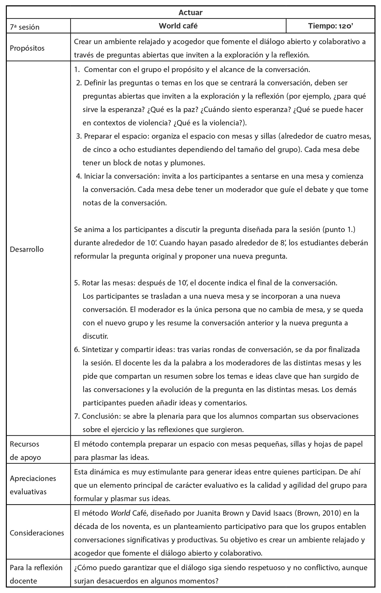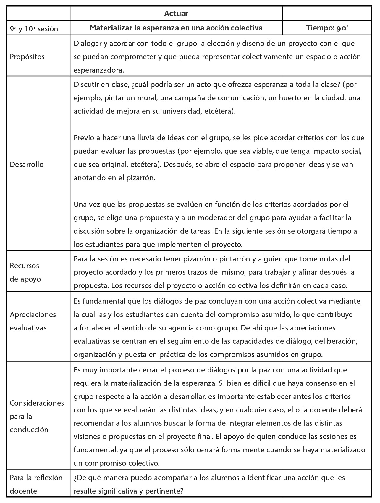 Retomando estos aportes, la propuesta destaca la relevancia de fortalecer los espacios de acción de los estudiantes. Una vez que hayan realizado ejercicios relacionados con la escucha y la creación de narrativas, se busca materializar las preocupaciones y los temas discutidos en una acción concreta. La acción permite asumir un compromiso como colectivo y favorece, en consecuencia, la construcción de vínculos humanos y humanizantes.